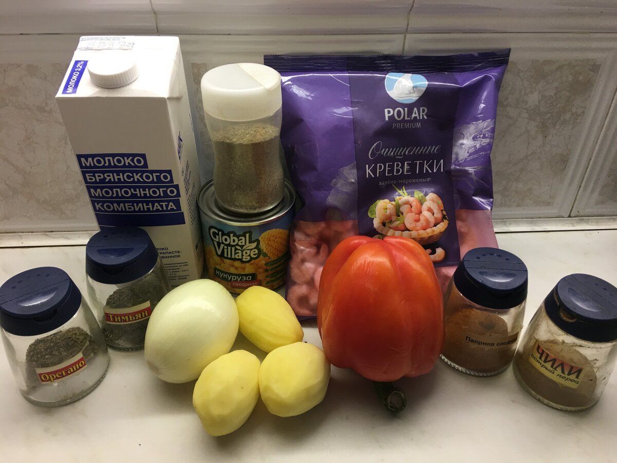 Первые французские переселенцы в южную часть Северной Америки варили себе густые супы на молоке или сливках, которые являлись первым и вторым блюдом одновременно. Предлагаю один из таких рецептов. Нам понадобятся: молоко (1,5 литра), банка консервированной сладкой кукурузы, полкилограмма очищенных варёных креветок, один болгарский перец, одна луковица, три небольшие картофелины, соль, чёрный перец, острый перец чили, сладкий перец паприка, травы - орегано, тимьян и др. Первым делом выливаем в кастрюлю молоко и ставим на плиту на средний огонь. Болгарский перец режем полосками толщиной в полсантиметра. Лук режем полукольцами такой же ширины. Картофель нарезаем тонкими брусочками. Выкладываем овощи в закипевшее молоко. Доводим молоко до кипения и всыпаем паприку для цвета и чили для остроты (по вкусу). Размешиваем содержимое кастрюли и добавляем соль и перец (можно использовать заранее смешанные пряности, см. рецепт на моём канале). Снова доводим молоко до кипения и варим суп на слабом о