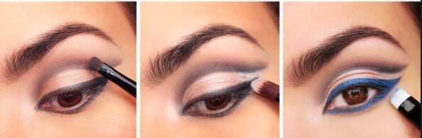 1.Нанесите светлый оттенок на все веко. 2.Сделайте контур карандашом по линии роста ресниц, на нижнем веке и в складке. 3.Растушуйте. 4. Продублируйте карандаш темно-серыми тенями. 5.Во внешний уголок нанесите светло-серые тени. 6.Синими тенями (влажной кистью) нарисуйте стрелку и подведите нижнее веко. 7.Накрасьте реснички.