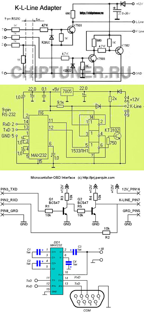 Второй преобразователь, TTL в ISO 9141, в классической схеме собран на четырех транзисторах, далее, для экономии и технологичности, стали использовать всевозможные микрухи с компараторами, логикой и т.д. и в финале перешли на микрухи представляющие готовый ISO 9141 интерфейс, сее самое удобное. Чуть не забыл, самые самый первые адаптеры были вообще с одним преобразователем :-)