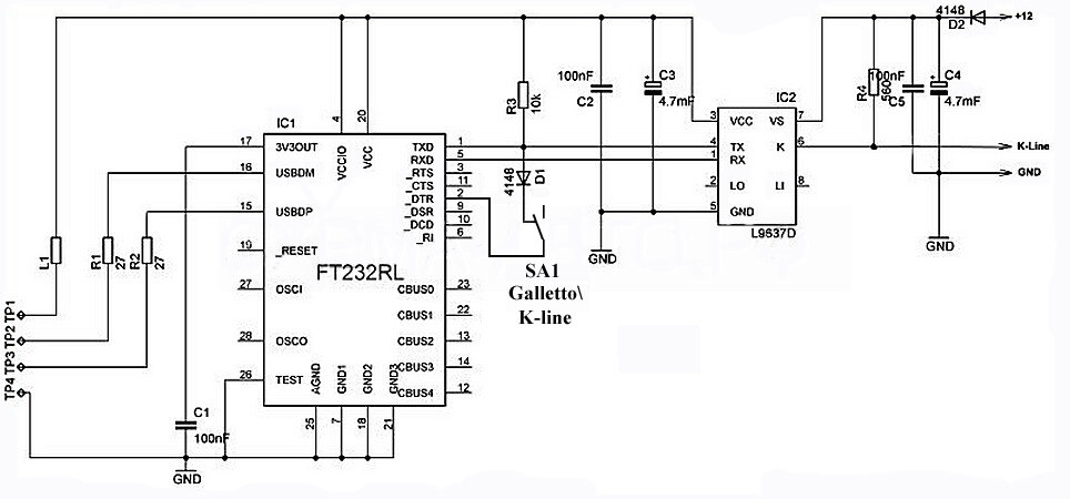 Изготавливаем универсальный адаптер galletto 1260\K-line из подручных материалов. Понадобился мне адаптер для прошивки ЭБУ galletto 1260, у меня уже давно есть MPPS, всем устраивает и работать приятно с ним, но вот для некоторых экспериментов потребовался galletto. Так как он мне нужен для разовой вещи то заказывать и ждать пока привезут из китая смысла нет, решил сам сделать из подручных материалов. Так же поставлю на него переключатель galletto\K-line, что б его как простой диагностический шнур его можно было использовать. Вот показываю как сее можно сделать быстро и не принужденно из подручных материалов. Потребуется эмулятор СОМ порта на FT232RL и микросхема интерфейса L9637D, эти детальки есть всегда под рукой у всех кто занимается мелким ремонтом и экспериментами. Так как все предельно просто то подробно расписывать не буду, просто делюсь идеей как можно галетку по быстрому сотворить. Начнем со схемы. Схема самая простая. Даже и комментировать нечего. Я только добавил в нее п