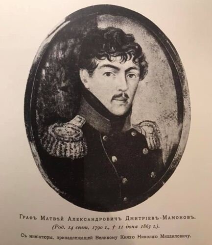 Жизнь Матвея Александровича Дмитриева-Мамонова (1790-1863) — яркий пример того, какая жестокая судьба может быть уготована тем, кому от рожденья вроде бы «всё дано». Граф, сын генерал-адъютанта и фаворита Екатерины, прямой (по мужской линии) потомок Рюриковичей. Миллионер, владелец 15 тысяч душ крепостных и нескольких десятков имений в разных губерниях России. Даже внешне был очень похож на Петра I, и так же, как первый русский император, обладал огромной физической силой. Получил прекрасное образование в России и во Франции. Отечественная война 1812 года предоставила Матвею Мамонову дополнительный шанс отличиться. Император Александр I разрешил 22-летнему графу организовать собственный кавалерийский полк. Мамонов пожертвовал на создание полка три миллиона рублей и снарядил около тысячи человек из числа собственных крепостных, а также городских волонтёров. Полк графа Мамонова участвовал в Зарубежном походе русской армии 1813 года, а сам граф был награждён золотой саблей за храбрость в
