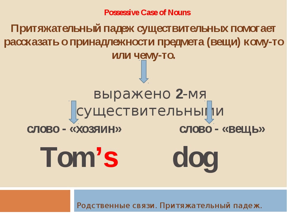 Одной из грамматических категорий существительных в английском языке является падеж (case). Он показывает отношения данного существительного (noun) с другими словами в предложении и выражается определенной формой этого имени существительного. Как мы помним, в русском языке шесть падежей, а вот в английском всего два: общий (common case) и притяжательный (possessive case). Мы поговорим отдельно о каждом падеже в английском языке. Общий падеж в английском языке Значение имен существительных в этом падеже носит общий характер (general meaning) , более того, имена существительные в этом случае не имеют окончаний. Одним словом, имена существительные в этом падеже имеют такую форму, которая указана в словаре, то есть первоначальную. Для примера можно взять любое имя существительное (book, table, street, building) – это и есть общий падеж в английском языке. Притяжательный падеж в английском языке Изучению этого падежа в английском языке мы посвятим больше времени. Что такое притяжательный па