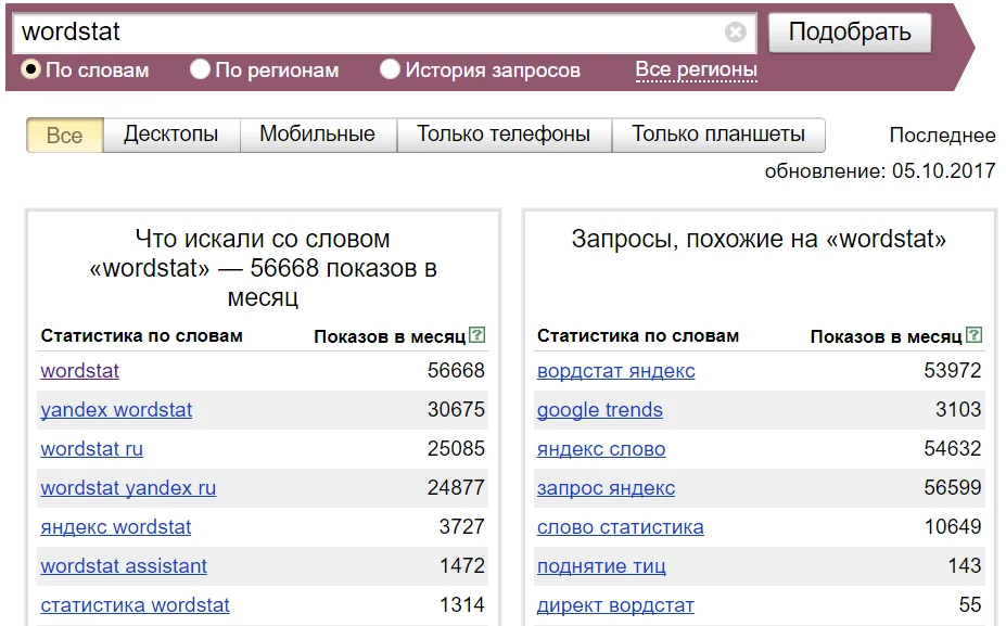 Что это такое? Яндекс Вордстат — это сервис по подбору ключевых фраз, который собирает статистику по пользовательским запросам. Статистика Яндекса дает понимание о том, какие слова и фразы посетители набирали в поисковой строке. Пользователь сервиса может проверить интерес потенциальных клиентов к товару или услуге. Вордстат поможет решить следующие задачи: Как начать пользоваться сервисом? Чтобы воспользоваться Яндекс Вордстат, передите на сайт wordstat.yandex.ru, авторизуйтесь в системе или зарегистрируйте аккаунт. В строке поиска напишите слово или фразу, которую человек может ввести, чтобы найти нужное предложение. Нажмите справа кнопку «Подобрать». Фразы можно писать в именительном падеже, Яндекс учтет результаты также в других формах. Когда наберете ключевое слово или фразу, появится прогнозируемое число показов по вашему запросу. Прогноз учитывает статистику поиска за 30 дней именно в Яндексе. Слева показывается рейтинг слов, которые посетители набирали в поиске. Цифры в ре