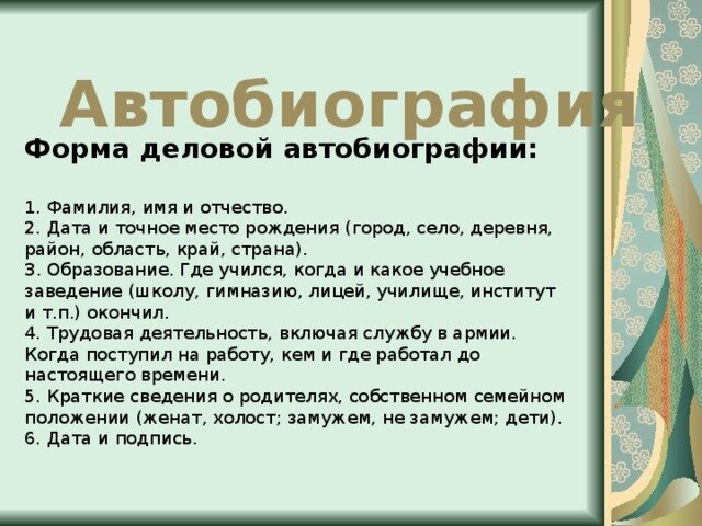 Законодательство сегодня не содержит четких требований на предмет того, что нужно отражать в автобиографии. Однако практика выработала некоторые каноны, которых желательно придерживаться. Итак, начать следует с названия документа и его даты. Дальше последовательно изложить свой жизненный путь.