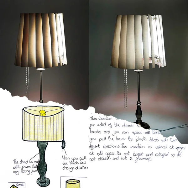 Ты на канале Бравый Дизайн, здесь ты можешь найти множество статей посвященных дизайну в самых смелых и дерзких его проявлениях. Детская фантазия - бескрайний источник для вдохновения, дети видят мир таким как он есть, без сложной технической составляющей и какого-либо личного опыта. К сожалению, человек в ходе взросления теряет возможность видеть мир глазами ребенка. Оптимизация процесса, практичный подход, личный опыт использования - все это делает нас не только опытнее и умнее, но и ограничивает невидимыми рамками, именно поэтому взрослому человеку зачастую так сложно изобрести что-то концептуально новое. Сейчас вы увидите один интересный эксперимент, где основные идеи изобретений придумали дети и даже попытались их нарисовать, а уже профессиональные работники реализовали эти дизайн объекты. Абажур-жалюзи Замечали ли вы, когда смотрели на торшер, что абажур внешне напоминает жалюзи? Нет? А вот ребенок, который придумал этот абажур не только легко провел параллели между этими п