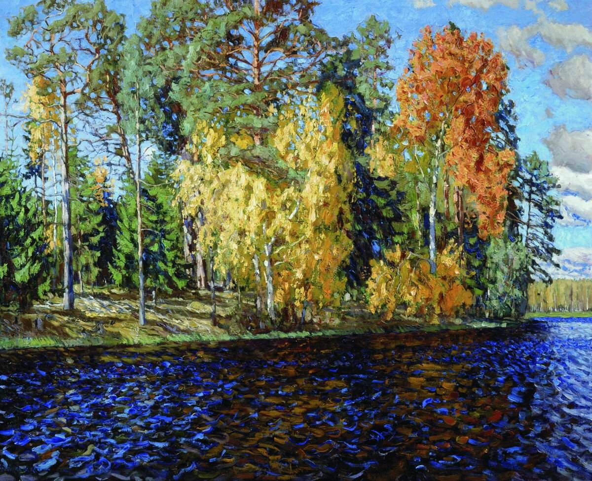 Первая картина, о которой хотелось бы поговорить, - это “Лесное озеро. Золотая осень” Станислава Жуковского. По-другому произведение называется “Синяя вода”. Действительно, значительную часть пейзажа занимает водоем ярко-синего цвета, который вместе с голубым небом и создает впечатление именно ранней, а не глубокой осени. Некоторые деревья уже подверглись окраске, а некоторые остались зелеными. Это означает, что перед нами вторая половина сентября. От этой картины чувствуются тепло и свежесть.