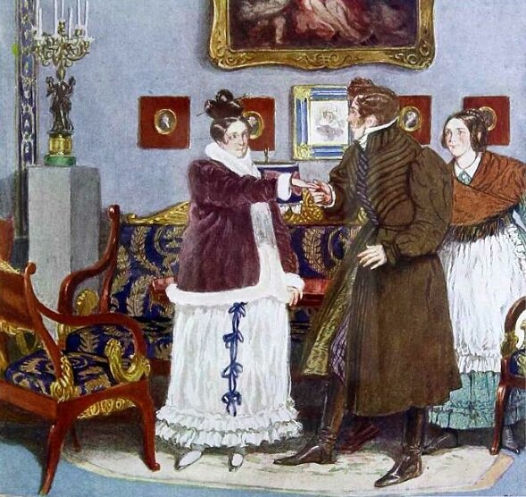 Кстати, посмотрим и на встречу Чацкого с Фамусовым: Павел Афанасьевич сердечно его обнимает, приветствует.