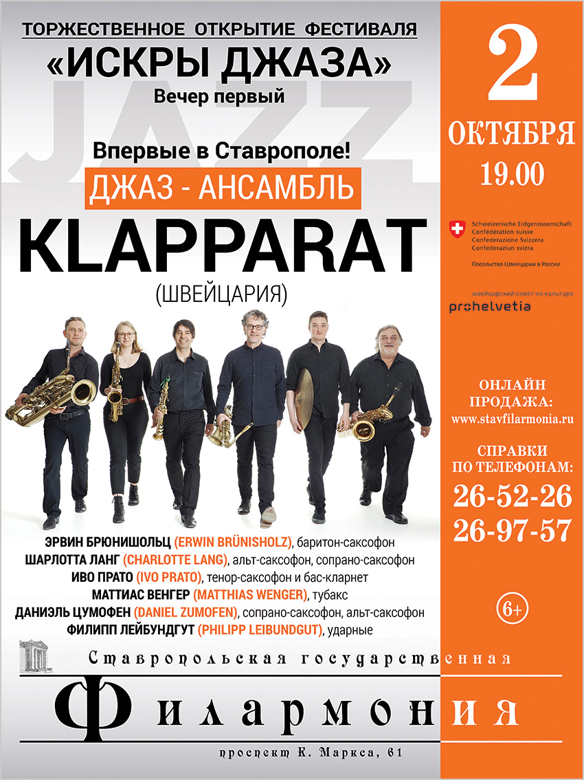 Филипп Лейбундгут (Philipp Leibundgut), ударные Пять саксофонистов используют все типы инструментов, допускающие транспортировку без применения грузового автомобиля (и даже редчайший тубакс, который изготавливается под заказ единичными экземплярами). Барабанщик дополняет их затейливое взаимодействие до результата, который оказывается порой чуть ли не танцевальной музыкой для большого танцпола. И в основе всего этого — тот современный европейский джаз, ритмика и драйв которого давно оторвали от привычно-традиционного. История необычного секстета началась в июне 2011 года (барабанщиком первого состава был Филипп Дюкоммюн). Музыканты, составившие Klapparat, представляют и джазовую, и классическую сцену. Мас