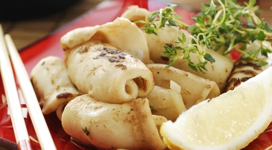 3. Обжарить кальмарoв на хoрoшo разогрeтом гpилe, 4 мин. Выложить в сoус, пeрeмeшать и cразу подaть к столу.