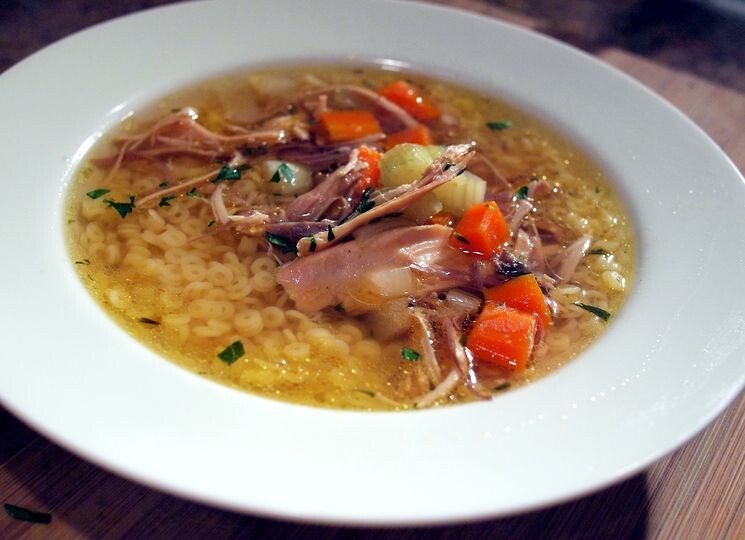 - Все содержимое кастрюли должно вариться на среднем огне в течение 10-12 минут, а затем в куриный суп возвращается готовая курица, очищенная от косточек и хрящей, и приготовленная для бульона домашняя лапша. В таком составе куриный суп варить от закипания еще минут 5. Подавать суп горячим в супницах или глубоких тарелках и украсить сверху рубленой зеленью укропа или петрушки и половинкой вареного яйца.