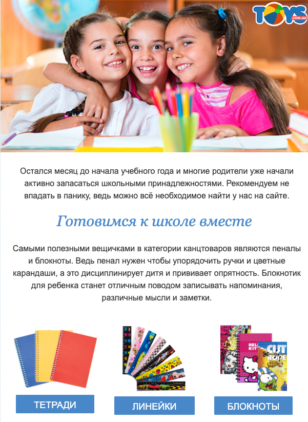 Можно смело информировать в email рассылках о новых или текущих акциях августа-сентября 2019, особенно если это товары для школы.