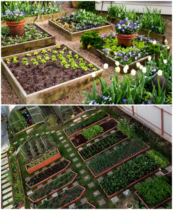 Огород с отдельными грядками выглядит намного опрятнее и привлекательнее, чем участок сплошь засаженный овощными кустиками. Для зонирования грядок на участке можно соорудить специальные приподнятые грядки или просто оградить каждую деревянным, кирпичным или пластиковым бортиком.