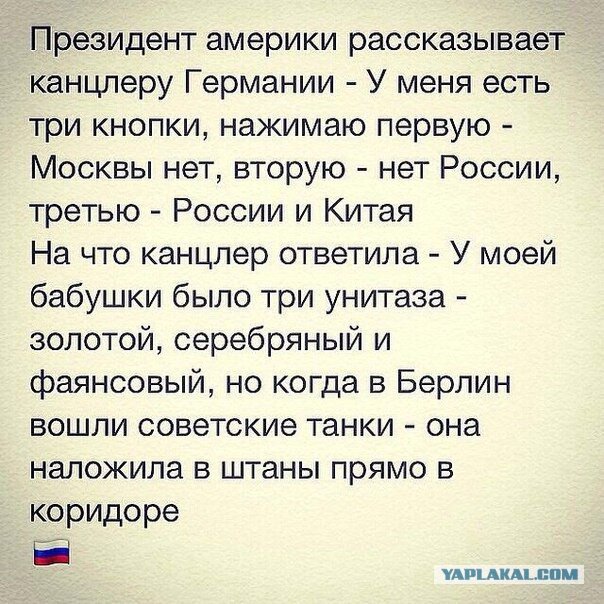 — Мой пес перед скачками всегда слушает записи с немецкими маршами и поэтому постоянно побеждает. Американец: — Мы с моим псом перед соревнованием всегда идем в Макдональдс, поэтому нам победа обеспечена. Русский говорит: — Ну, дела! Это все ерунда! Вот я своему псу перед стартом наливаю нашей водочки, граммов так 200! Немец и американец в один голос: — И что, он побеждает после этого? — А на фига нам это! Зато на старте он самый веселый и забавный! Комментатор: — К прыжку готовится американский спортсмен! Шапочка монтана, лыжи монтана, костюм монтана. Толчок, разгон, прыжок! Великолепно, на 150 метров, прыгнул американский спортсмен! — К прыжку готовится немецкий спортсмен! Шапочка адидас, лыжи адидас, костюм адидас. Толчок, разгон, прыжок! Великолепно, на 290 метров, прыгнул немецкий спортсмен!— К прыжку готовится русский спортсмен! Шапка-ушанка, лыжи охотничьи и фуфайка. Толчок, разгон, прыжок и с криком "Мать вашу!!!" улетает за горизонт. Запустили немку. Час крики, два — откры