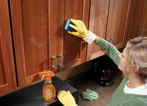 От жирного налёта на кухонной мебели не спасает даже мощная вытяжка, всё равно часть самых летучих фракций растительных и животных жиров минует её всасывающую решётку и понемногу осаждается на поверхностях. Так что остаётся только вовремя удалять жировой налёт, не давая ему закоксоваться – тогда уже придётся применять сильнодействующие средства, о которых я расскажу вам в конце материала. Чем удалять? Давайте знакомиться с простыми способами вернуть дереву шкафчиков его природную красоту. Хозяйственное мыло + питьевая сода Половину куска хозяйственного мыла натереть на крупной тёрке в металлическую посуду, добавить воды в соотношении примерно 1 : 1, поставить на слабый огонь и помешивая, добиться полного растворения мыла. Должна получиться вязкая масса с сильным мыльным запахом. Её нужно немного остудить (примерно до 40-50⁰С) и добавить в неё 2 столовые ложки питьевой соды (натрия бикарбоната). Полученную кашицу понемногу набирать на губку для мойки посуди и круговыми движениями р