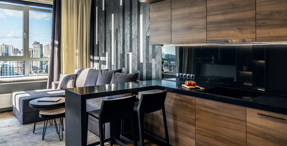 - Если у вас квартира-студия, то кухня с барной стойкой визуально разделит помещение на зоны.