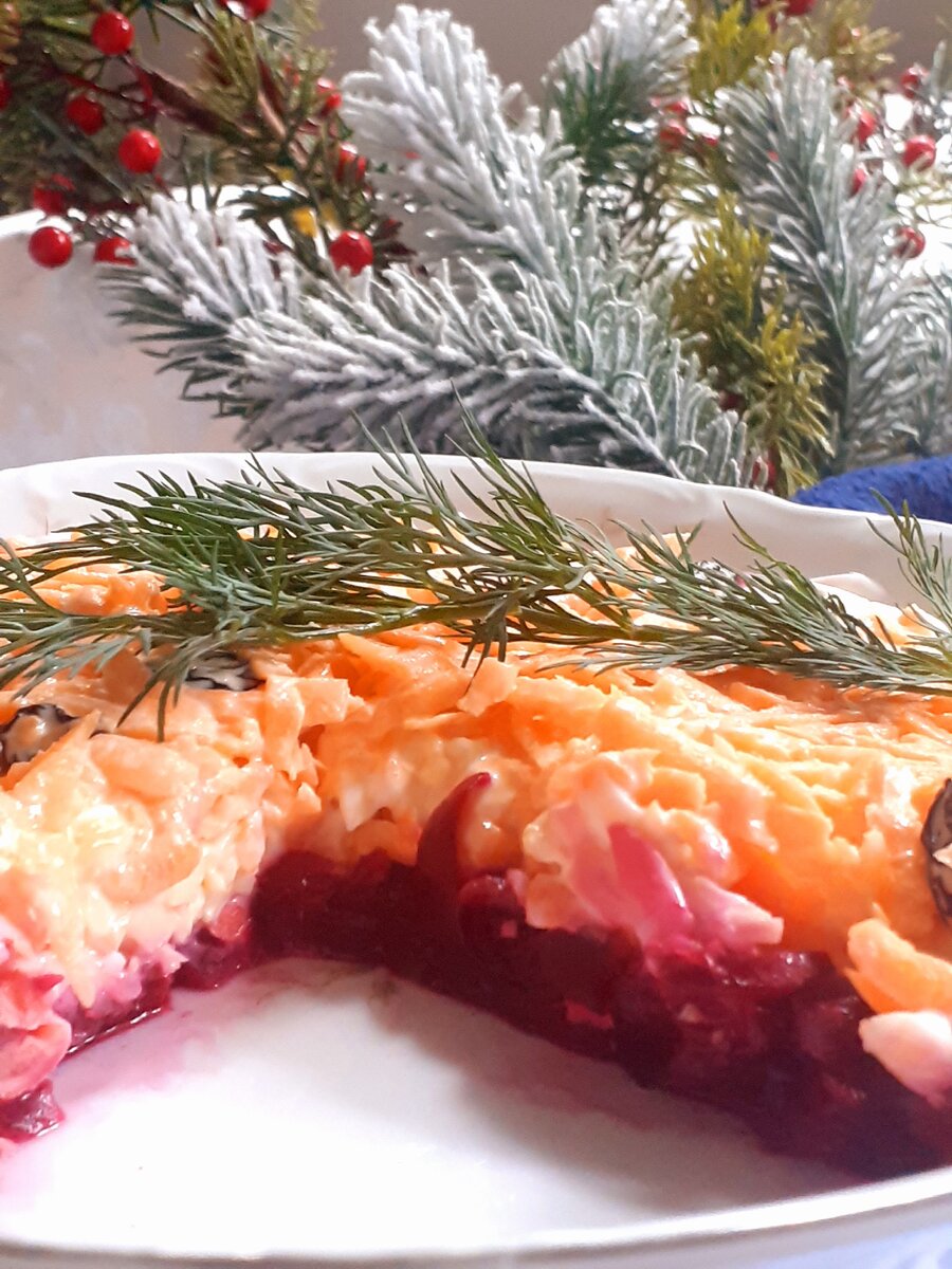 Морковь 3 шт. Кишмиш 2 ст.ложки Сыр тертый 100 г Чеснок 2 зубчика Свекла 1 шт. Орехи грецкие 4 шт. Майонез Зелень укропа 1. Очищенную морковь натрите на крупной терке, перемешайте с изюмом и заправьте майонезом (2 ст.ложка). 2. Чеснок очистить и измельчить. Сыр натереть на крупной терке и перемешать с чесноком. 3. Грецкие орехи мелко нарубить. Вареную свеклу очистить и натереть на крупной терке. Перемешать свеклу с орехами. 4. В салатник выложите слоями свеклу с орехами, сыр с чесноком и морковь с изюмом, смазывая слои майонезом, кроме верхнего - морковного. Украсить веточкой укропа. Приятного аппетита! Хорошего настроения! Спасибо, что дочитали до конца, не забудьте поставить "пальчик вверх" и поделиться рецептом с друзьями:) До новых встреч на канале "Кулинарный блокнот Екатерины".