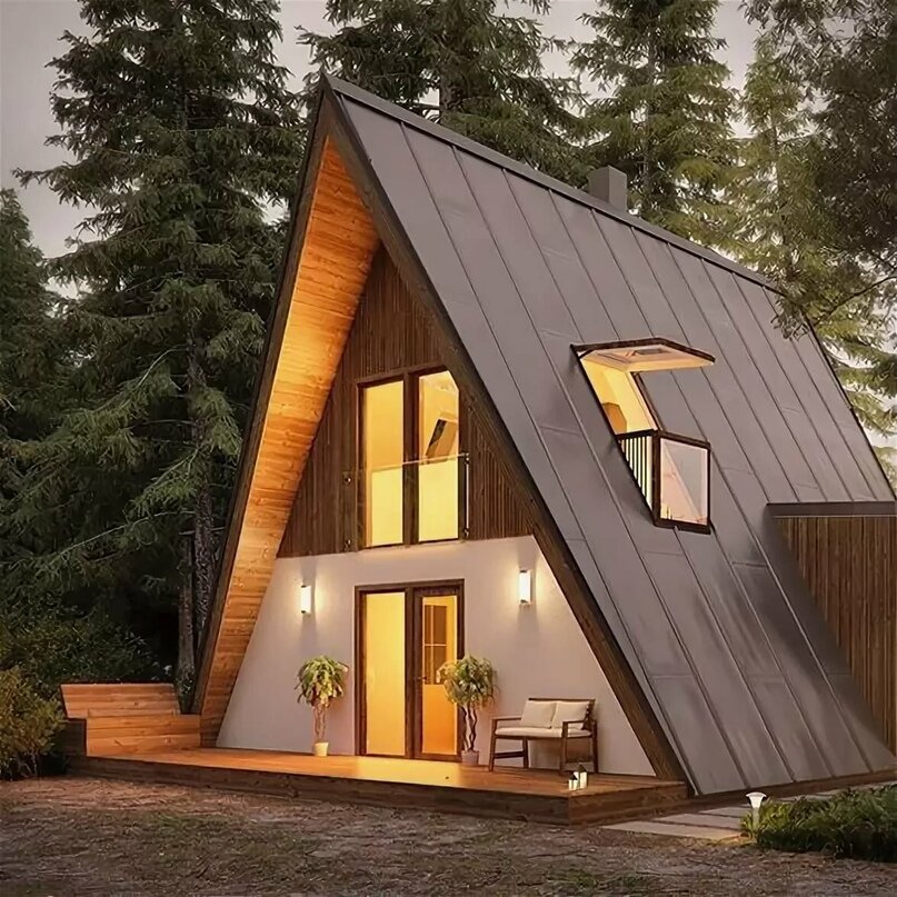 Сегодня A-frame house является альтернативой классическим постройкам, и состоит сплошь из современных строительных материалов. Особенно пользуются популярностью эксцентричные варианты любых размеров.