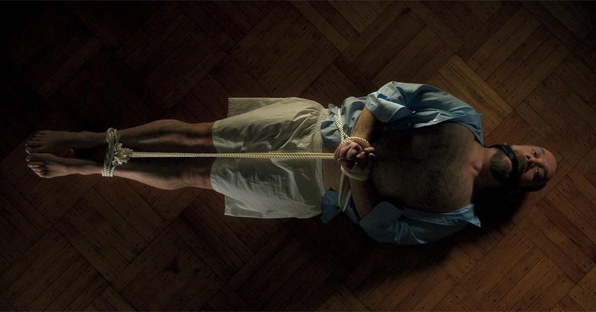 Немолодой мужчина лежит связанный по рукам и ногам и испуганно смотрит перед собой. К нему подходит дама в черном и спрашивает, надо ли его наказать, предупреждает, что могут остаться следы, и тушит об него сигарету.