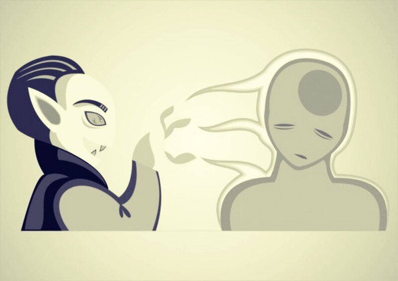 Аналогично эмоциональный слив. "Донор" несколько часов слушает монолог, ему скучно, у него много дел, но он боится показаться жестоким, не оказав другу сочувствия. "Вампирчик" выговорится и ему становится лучше. А донор, проникается чужим негативом и чувствует себя морально выпотрошенным. Но подобное происходит, если он будет смотреть новости и мрачные фильмы. Но это не значит, что телевизор ворует у него энергию.