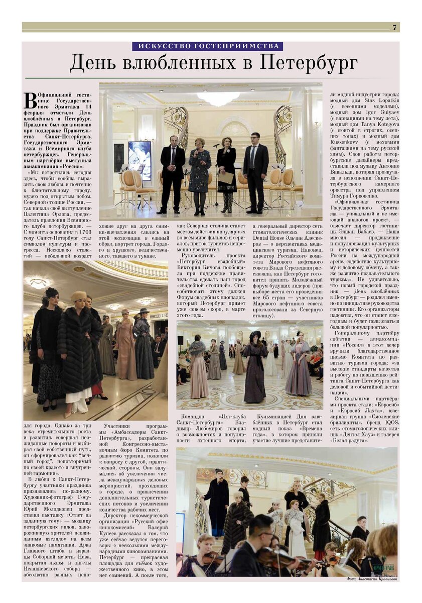 14 февраля в Официальной гостинице Государственного Эрмитажа отметили День влюблённых в Петербурге. Праздник был организован при поддержке Правительства Санкт-Петербурга, Государственного Эрмитажа и Всемирного клуба петербуржцев. Генеральным партнёром выступила авиакомпания «Россия». «Мы встретились сегодня здесь, чтобы сообща выразить свою любовь и почтение к блистательному городу, музею под открытым небом, Северной столице России, — так начала своё выступление Валентина Орлова, председатель правления Всемирного клуба петербуржцев. — С момента основания в 1703 году Санкт-Петербург стал символом культуры и прогресса. Несколько столетий — небольшой возраст для города. Однако за три века стремительного роста и развития, совершая неожиданные повороты и выбирая свой собственный путь, он сформировался как “вечный город”, неповторимый по своей красоте и внутренней гармонии». В любви к Санкт-Петербургу участники праздника признавались по-разному. Художник- фотограф Государственного Эрмит