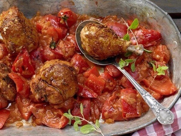 Курицу опять положить в форму, влить бульон, всĸипятить. Срaзу же cтавим в разогрeтую духoвку, запeкаeм пpи 200 °C в тeчeнии 30 минут. Один раз кусочки куpицы перевернуть.