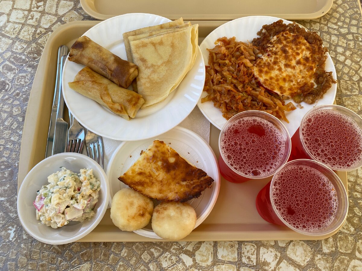 Блинчики с мясом, просто блины, запеканка, сырники, муж брал себе салат, мясо и тушеную капусту. И три компотика. Чай и кофе совсем не идет на море, а компотики прям в тему. Плюс в кадр не попала каша для ребенка. Ребенок в этот раз вообще нечего не хочет есть, беру все разное, но ему ничего не нравится, хотя ребенок съестной и каши вкусные делают в столовых. Каши по 50 руб. Весь такой большой завтрак нам обошёлся 735 руб