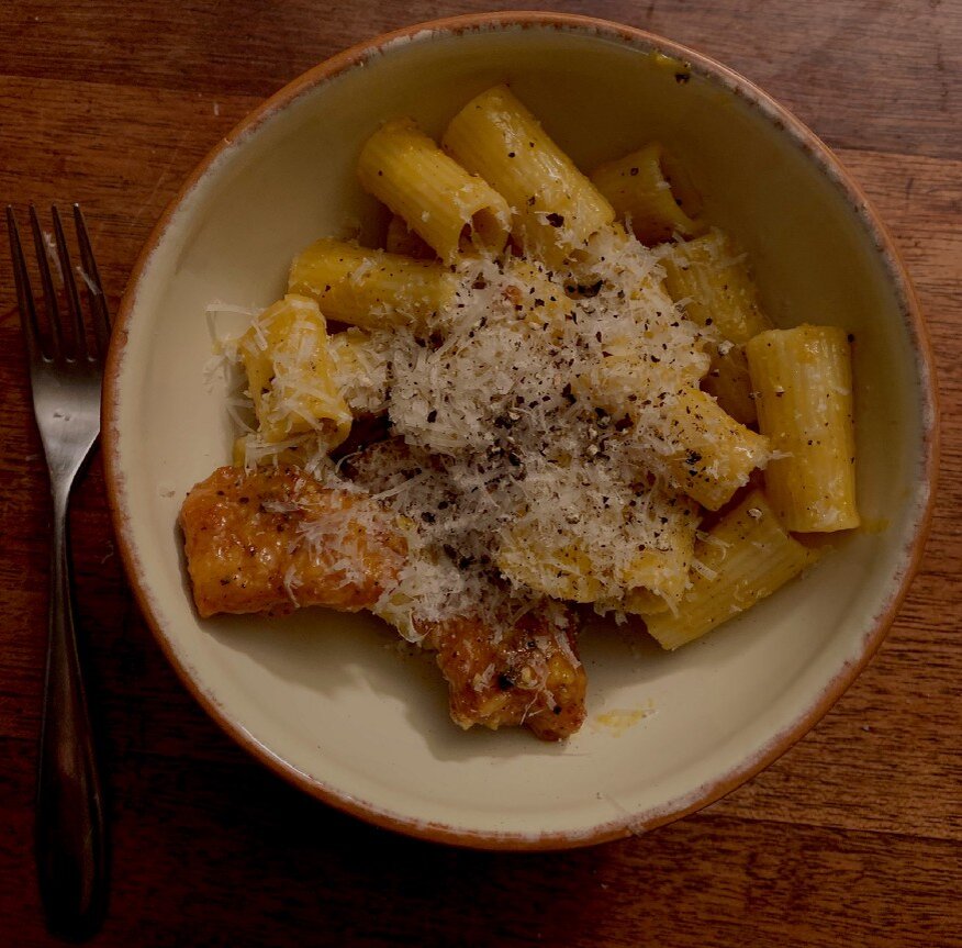 - Давайте соберем все это вместе! Вывалите пасту в смесь яиц и сыра, добавьте немного воды для пасты (больше, если вы хотите более жидкий соус). Как только вся паста будет покрыта смесью яиц и сыра, бросьте в нее жареные кусочки курицы и тщательно перемешайте еще раз. Тепло от пасты и курицы будет мягко готовить яйцо и нагревать сыр, в результате чего получится густой и липкий соус. Подавайте со свежемолотым черным перцем, еще немного сыра и соль по вкусу.