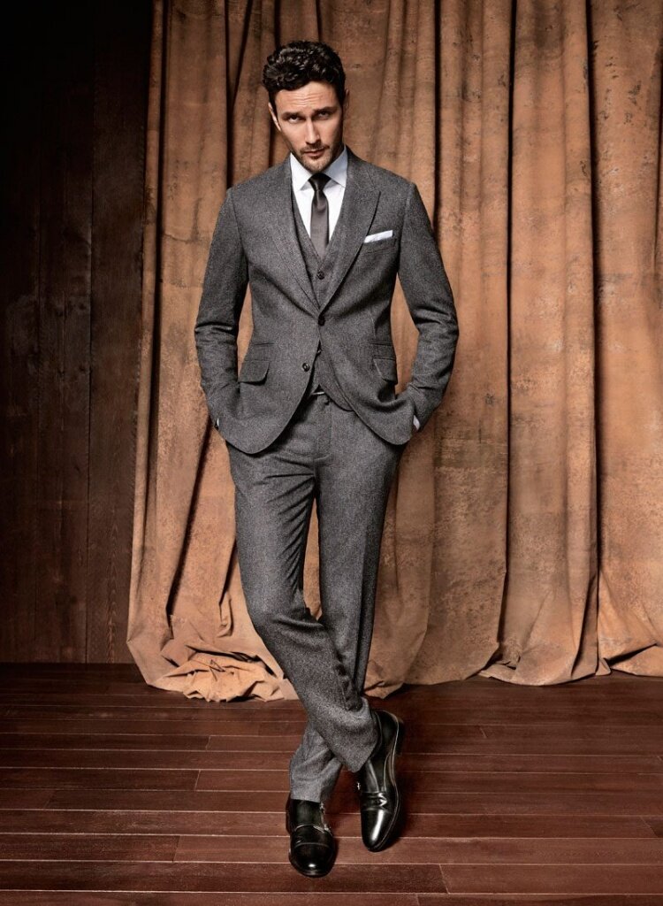 Черный костюм лучше всего подходит для приемов и прочих вечерних торжественных мероприятий. Это классический цвет смокинга и фрака. Он легко комбинируется с другими цветами, создает властный, самоуверенный и авторитетный имидж. В торжественном случае к черному костюму с белой сорочкой можно выбрать серый или голубовато-серый галстук. Серый костюм считается универсальным, выражает сдержанность, статус и профессионализм владельца. Серый цвет легко комбинируется с другими цветами, при этом подчеркивая корректность и уравновешенность. Бежевый – цвет для теплого времени года. Позволительна едва заметная клетка или малоразличимая полоска. Костюм в клетку или в полоску меняет имидж на стильный или спортивный. Чем крупнее и ярче рисунок на ткани, тем менее деловым выглядит его обладатель. Для такого рода костюмов предпочтительнее однобортный пиджак, надеваемый исключительно днем, в сочетании с однотонными рубашками, черными или коричневыми туфлями и однотонными носками. Костюм-трой