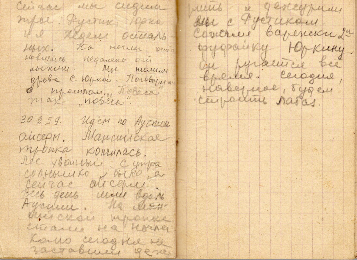 Трое ребят ушли вперед. Рустик, Юрка и Зина. Ждут остальных. Где остальные ???? Я так думаю пошли по тропе на юг. За якобы Манси, охотниками. Причем первые заночевали возле чьей то лыжни. Остальные похоже так и не присоеденились и Зина пишет, что замерзла и мерзла всю оставшеюся дорогу ( айсерм). 30,2,1959. Идем по Ауспии- такой даты не существует, в Феврале максимум 29 дней. Здесь уже идет