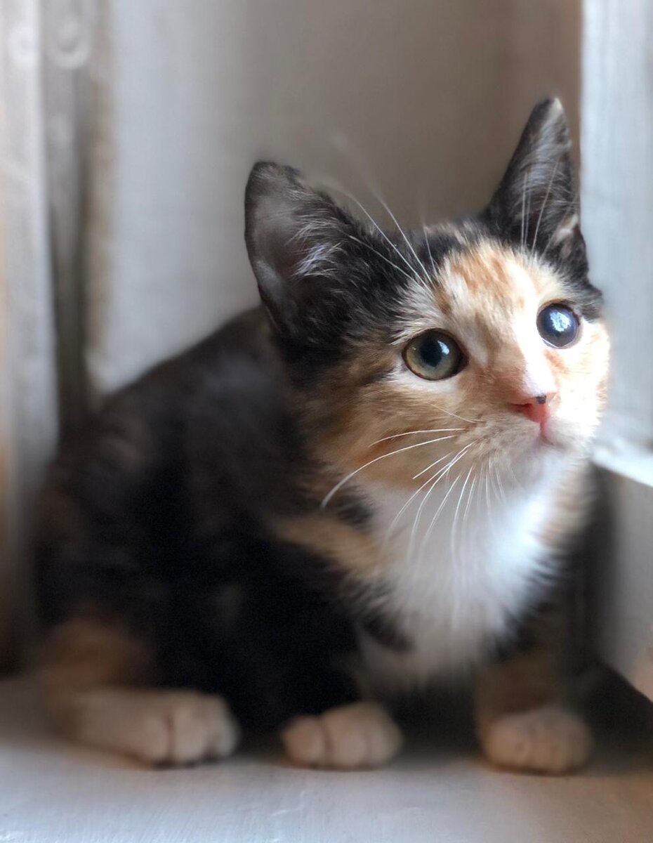 Мы так и зовем ее - Трехцветка. Бегала вместе с рыжим братиком по улице. Малышей поймали, обработали от блох и глистов, подлечили глазки. Последнее время очень много проблем с глазками у котят. Если чуть не успеть помочь, то у них впереди слепота и гибель.