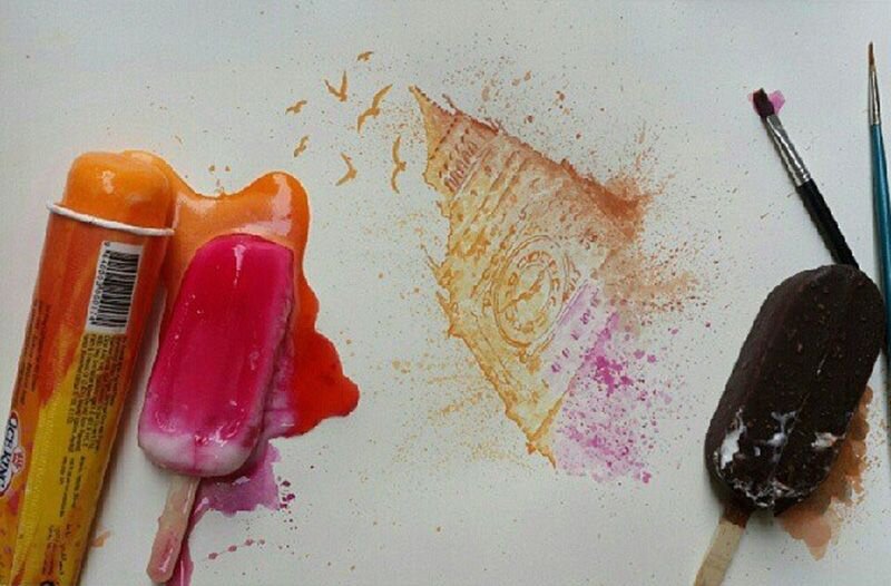 Багдадский художник совмещает приятное с …творческим и при создании своих работ вместо привычных красок использует мороженое. Его работы похожи на акварельные рисунки, имеют широкий спектр насыщенных цветов. Художник всегда фотографирует свои работы с остатками мороженого и кистями на холсте, тем самым показывая небольшую часть процесса превращения любимого десерта в искусство.