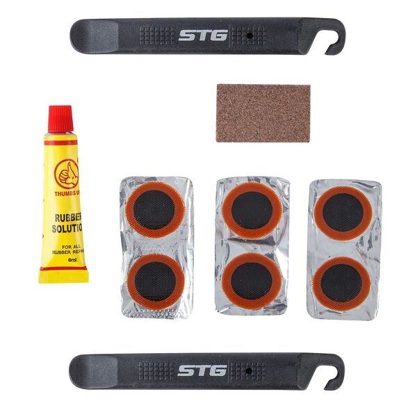 Велосипедной аптечкой называют набор специальных инструментов для быстрого заклеивания прокола в велосипедной камере. В этот набор обычно входит, специальный клей, заплатки, шкурка, монтажные лопатки.