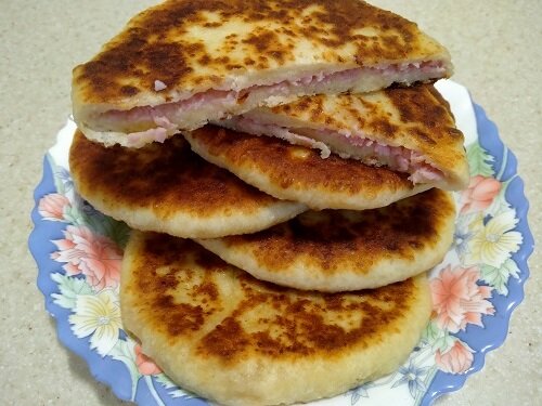 Сырные лепешки с ветчиной на кефире отличный завтрак или перекус в течении дня . Готовятся они довольно быстро , так же как и съедаются . Такие лепешки можно готовит с любой вашей любимой начинкой . Все зависит от ваших предпочтений . Для приготовления лепешек нам понадобится; Приступаем к приготовлению ; Для начала натрите сыр на мелкой терке . А ветчину натрите на крупной терке . В глубокой миске смешайте кефир с содой , солью и сахаром . Хорошенько перемешайте и добавьте тертый сыр и муку . Замесите тесто . Тесто должно быть не липким . Тесто скатайте в колбаску и разделите его на 8 примерно равных частей . Каждый кусочек скатайте в шар , а затем раскатайте в лепешку . Положите на середину лепешки порцию начинки . Края лепешки соберите на верху и хорошенько защипните их . Снова раскатайте тесто с начинкой в лепешку . Лепешки обжарьте на сковороде с растительным маслом , с обеих сторон . Подавайте сырные лепешки к чаю или кофе , или в качестве перекуса . Они хороши как в г