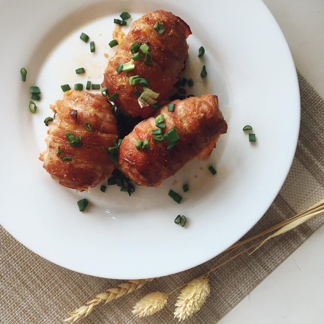 Разнообразьте ваши ужины вкусными мясными рулетиками! Ингредиенты для мясных рулетиков с сыром: Как приготовить мясные рулетики с сыром в беконе? 1. Измельчаем прессом чеснок и лук, смешиваем с фаршем. Добавляем две ложки панировочных сухарей, приправу для мяса, соль, перец. Тщательно перемешиваем. 2. Из фарша делаем лепешки и кладем туда по протертый сыр. 3. Формируем продолговатые котлетки так, чтобы сыр не был виден. 4. На каждую котлету понадобится 2 полоски бекона, в них заворачиваем биточки. 5. Форму для запекания смазываем маслом, либо кладем пергамент, выкладываем рулетики и смазываем их яичным желтком, чтобы в процессе готовки появилась румяная корочка. 6. Ставим рулетики на 30-40 мин в предварительно разогретую до 180 градусов духовку. Приятного аппетита! Оставьте любой комментарий, если вам пригодился рецепт.
