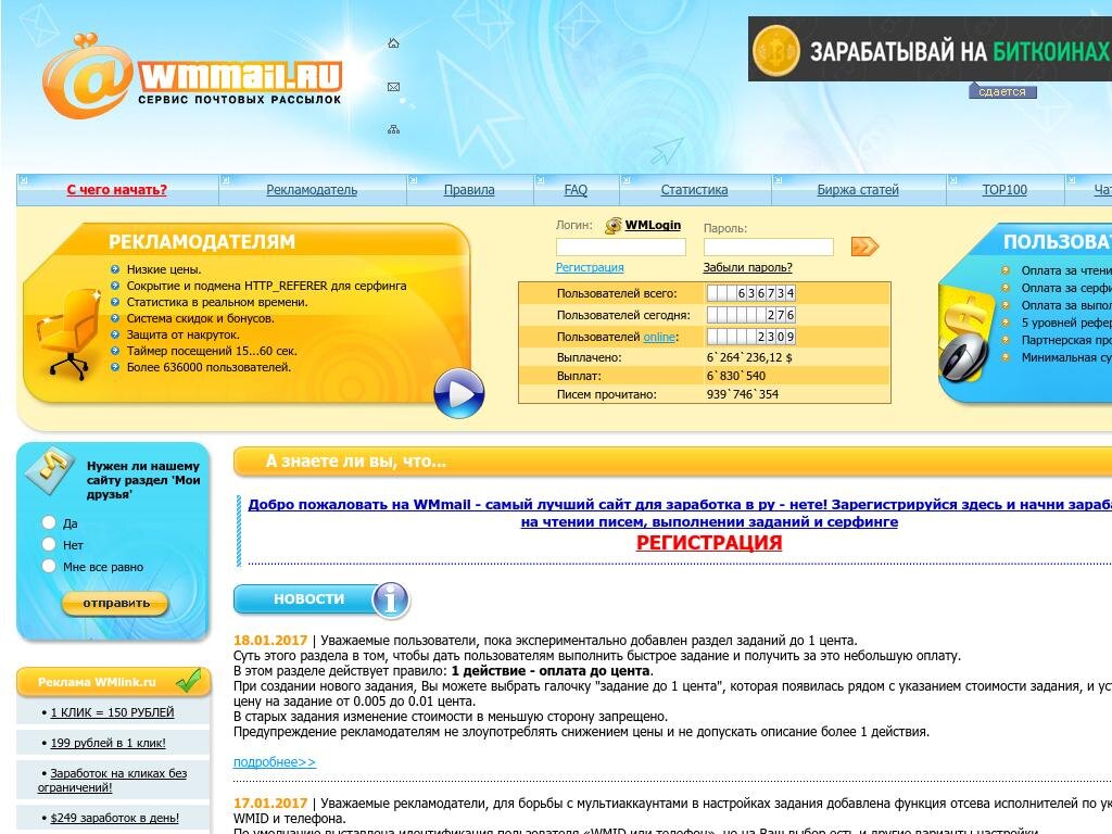 Здравствуйте , хотел с вами поделиться не плохим сайтом для заработка в интернете на кликах , просмотре рекламы , просмотрах видео , переходам по сайтам .... Переходите по ссылке и регестрируйтесь http://www.wmmail.ru/index.php?cf=reg-newr&ref=Vektormen911 Реальный заработок на лучшем в рунете почтовике wmail.ru, деньги всегда выплачиваются, работает спонсор довольно долго и стабильно, запуск проекта был в 2004 году. Для того чтобы зарабатывать на нем нужен кошелек системы Webmoney - для регистрации в системе и вывода денег из нее, а также вам нужна электронная почта.
