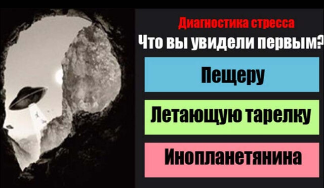 Если вы являетесь стрессоустойчивым человеком, то вам невероятно повезло, ведь это качество позволяет сберечь свою нервную систему и, как следствие, здоровье в целом. Данное состояние является травмирующим для психики человека и оставляет после себя неприятное послевкусие. Что вы увидели первым? Пещера Летающая тарелка Инопланетянин Если вы самостоятельно не можете оценить уровень своей стрессоустойчивости, есть возможность это сделать прямо сейчас. Для этого необходимо посмотреть на картинку и сказать, что вы увидели в первую очередь? ПЕЩЕРА Если вы увидели пещеру, то уровню вашей стрессоустойчивости можно только позавидовать! Это замечательный результат, так как вам подвластно умение принимать взвешенные решения, несмотря на напряженную обстановку вокруг. Так гораздо проще жить! ЛЕТАЮЩАЯ ТАРЕЛКА Если же вашему взору открылась прежде всего летающая тарелка, то подверженность стрессу составляет 99.9 %! Это очень опасный уровень, при котором вопрос необходимости поработать н