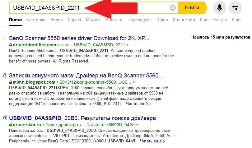Покажу поиск на одном примере. Вот у меня старый сканер, но Windows не нашла