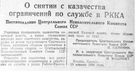 Весной 1936 г. с казаков сняли ограничения по службе в РККА (Рабоче-Крестьянская Красная Армия). Власть хотела заручиться поддержкой бывшего военного сословия на случай внешней агрессии.