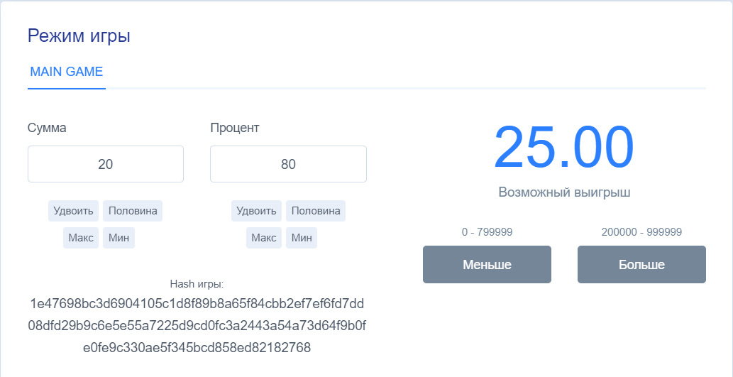 Сервис мгновенных игр. Сайт - https://bitly.su/n6h2tI8 При депозите в 200 рублей , ставим шанс 80% и ставим 20 рублей на меньше, потом 25 р на меньше, 31.25 рублей на больше, 39.06 на больше , потом ставим 70% , выбираем сумму 48.83 и нажимаем на меньше, после этого ставим 69.76 на больше, на этом полоса заканчивается, и начинаем все с начало.
