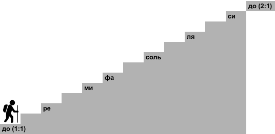 Вам даже безразлично, с какой ступени вы начали идти, потому что все они одинаковые. Теперь попробуем подниматься только по ступеням, обозначенным как ноты: