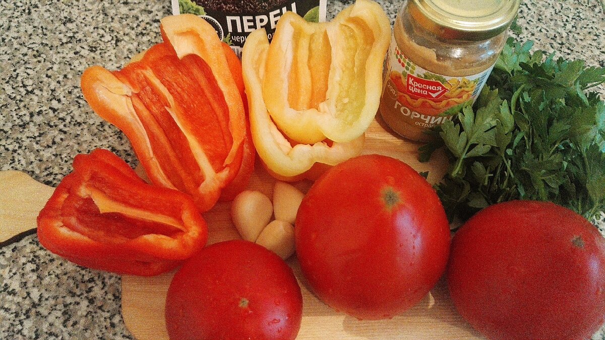Нарезаем болгарский перец. Выкладываем его на противень и в духовку не надолго. До мягкости. Как только перец станет мягким вынимаем противень из духовки, а с перца снимаем кожицу.