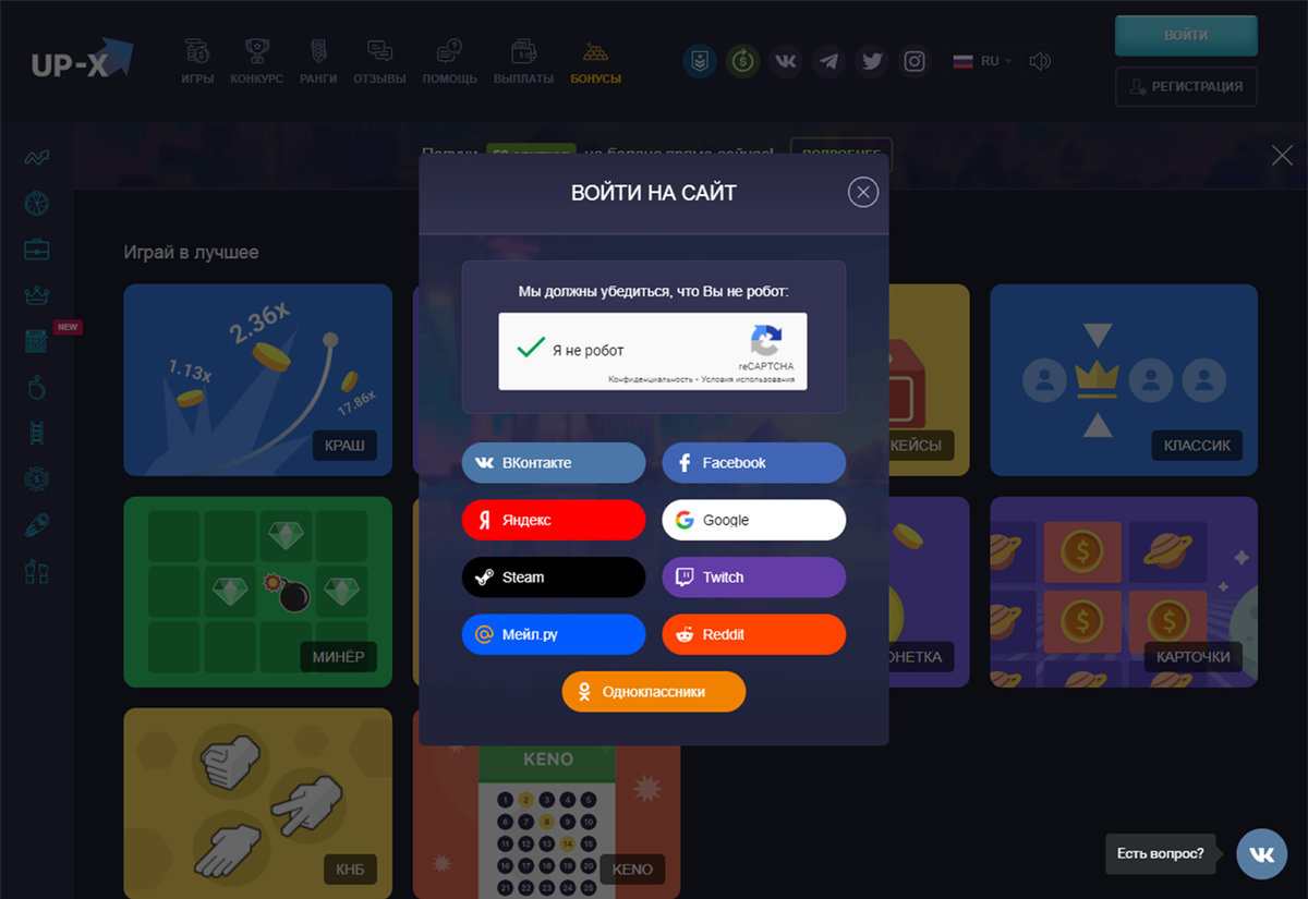 И зарабатывать мы будем на игре "Краш" . Долгое время я просто сидел и наблюдал за этой игрой, когда график идёт вверх и резко останавливается и определил для себя такую закономерность, что если забирать деньги на 1.3х то почти всегда можно выигрывать. Заметьте "почти всегда". Да тут бывают моменты что график идёт аж до 20х, а бывает и такое что на 0 останавливается. Главное, вовремя забрать денежки и не паниковать. Ну а тем, у кого просыпается азарт, нужно перед каждой игрой делать паузу в 5 - 10 минут, чтобы остыть. Итак, для начала нам нужно пройти регистрацию на данном сервисе