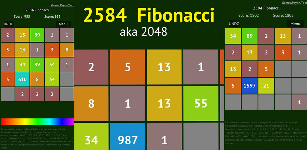2584 Фибоначчи Смысл игры как и в классических вариантах игр, 1024 или 2048, набор максимального количества очков. Но с использованием числе ряда Фибоначчи Переработанная и расширенная версия знаменитого 2048, вы найдете не простой, но затягивающий игровой процесс.