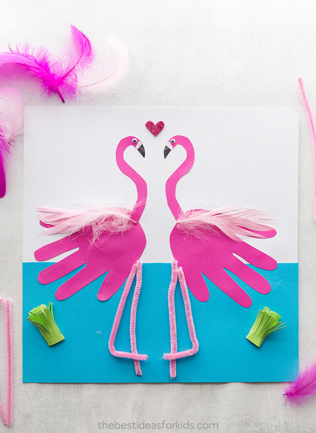 Давайте вместе смастерим веселую летнюю поделку - открытку с розовым фламинго. Дополнительные элементы в виде перьев и пружин оживляют картинку! Что нужно: Как делать: 1. Отрежьте половину синего картона и приклейте на белый картон. Обведите отпечатки рук на розовом картоне, вырежьте и приклейте их поверх синей и белой бумаги, оставив не приклеенной верхнюю часть. 2. Нарисуйте форму шеи и головы фламинго на розовом картоне, сложите его пополам, чтобы получилось по две шеи и головы одинакового размера. Вырежьте. 3. Приклейте шею и голову фламинго, подложив их под отпечатки ладоней. Затем, вырежьте из белой бумаги два клюва и приклейте их на голову фламинго. Добавьте черный кончик на клюве, вырезанный из черной бумаги. Приклейте глаза. 4. Теперь добавьте перья и пушистую проволоку! 5. Возьмите зеленую бумагу и сделайте в ней небольшие прорези. Сверните ее и приклейте к синей бумаге. 6. В качестве финального штриха вырежьте маленькое сердечко из блестящей бумаги и добавьте его на ве
