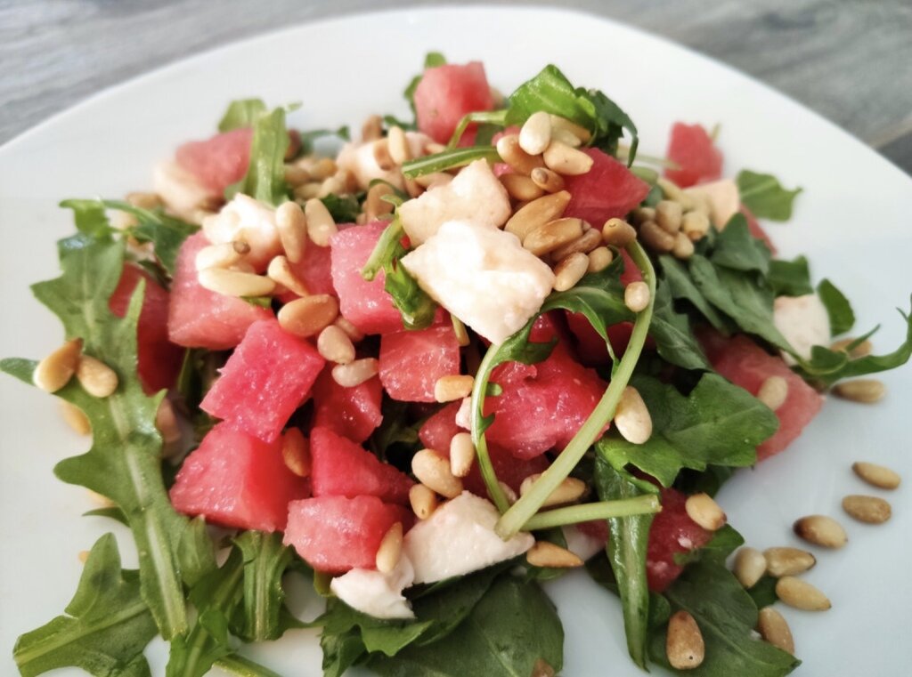 Добрый день, дорогие читатели! Спасибо, что проявили интерес и заглянули на мой канал. Надеюсь, что моя статья окажется для Вас интересной и полезной. Желаю Вам приятного прочтения. Хочу поделиться с Вами еще одним рецептом освежающего летнего салата с арбузом. Рецепт салата с арбузом и сыром фета смотри по ссылке ниже: Арбузный десерт или салат? Необычное сочетание и неожиданный вкус, который Вас приятно удивит! Попробуем новую вариацию арбузного салата в сочетании с рукколой и моцареллой. Руколла придает особую орехово-пряную ноту салату. Вместо арбуза можно использовать клубнику, малину, виноград и другие сезонные ягоды и фрукты. Экспериментируйте, пробуйте и открывайте для себя новые приятные сочетания и необычные вкусы! Для данного рецепта понадобятся следующие ингредиенты: Для салата: 1/2 арбуза среднего размера (400 -50 г); 125 г сыра моцарелла; 80 г рукколы; 2 ст. ложки тыквенных семечек (можно заменить семечками подсолнечника или кедровыми орешками); 1 ч. ложка меда; 2