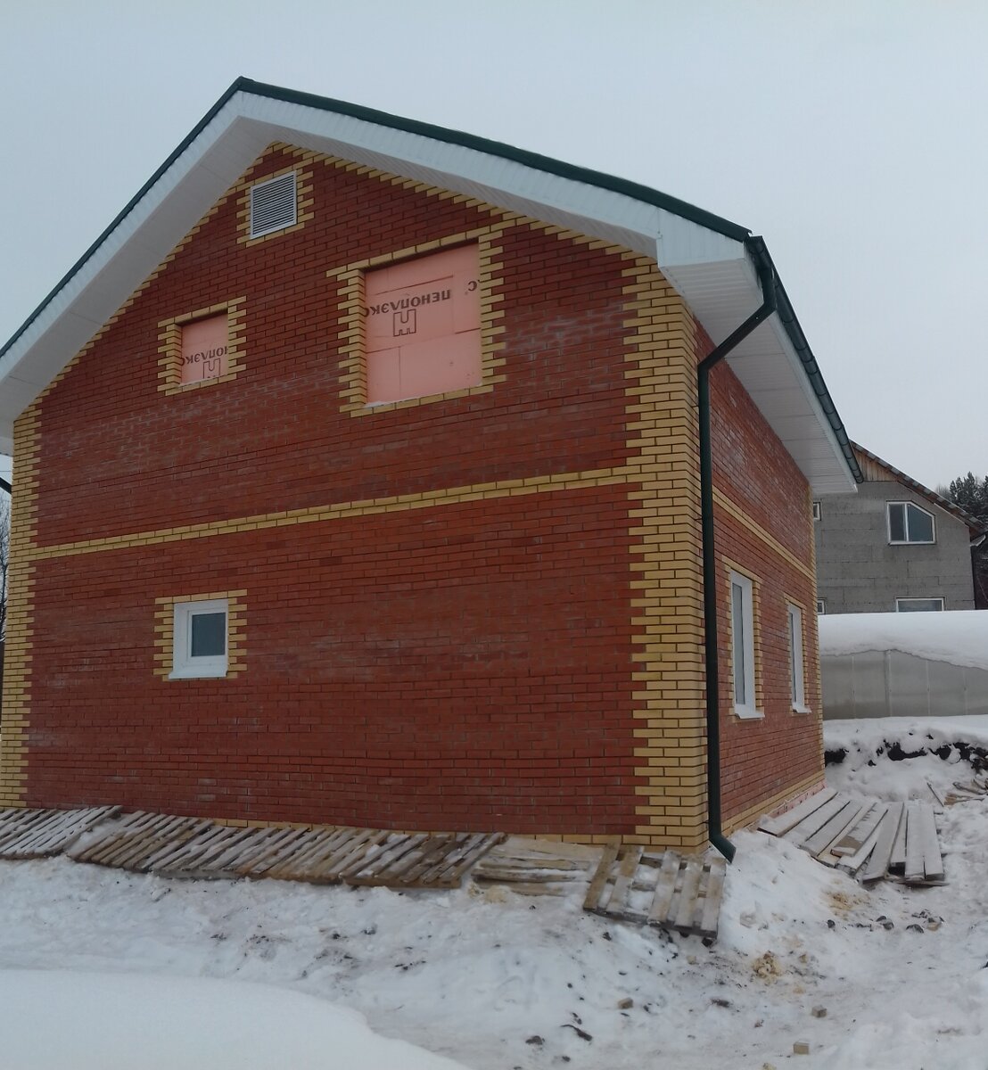 Проблема решена, дом стоит жёстко. Впереди ещё работа по устройству входной группы - тут заказчик планировал сделать что-то типа крытой террасы.