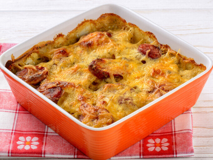 Картофель, запеченный с колбасой ) Колбаса - 400 гр Масло растительное - 3 ст. л. Мука - 3 ст. л. Молоко - 3 стакана Кайенский перец - щепотка Картофель (крупный, ломтиками) - 6 шт. Лук репчатый (измельченный) - 1 шт. Соль - по вкусу Перец - по вкусу. Способ приготовления. Колбасу отварите в воде в течение 15 минут. Выложите и дайте остыть, затем нарежьте на небольшие кусочки. В сковороде растопите масло, добавьте разведенную молоком муку и варите, непрерывно помешивая, 10 минут. Добавьте кайенский и черный перец по вкусу. Уберите сковороду с огня. Разогрейте духовку до 220°С. В форму положите картошку, лук и колбасу. Залейте приготовленным соусом. Запекайте 45 минут. Как и с чем подавать Подавайте блюдо горячим. Приятного аппетита!