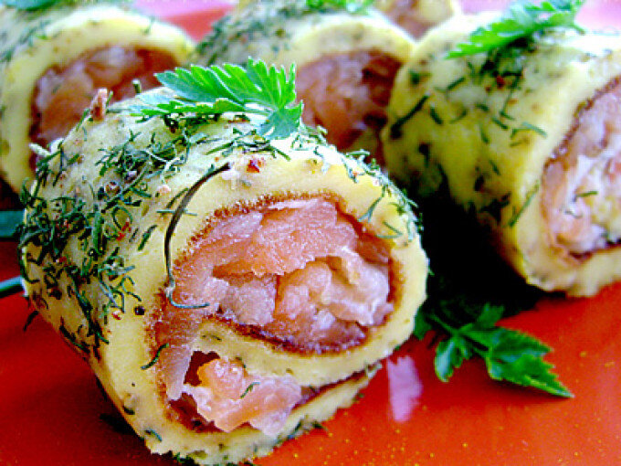 Ингредиенты: Яйцо - 1 шт. Мука - 1/2 ч.л. Масло растительное - 1-2 ст.л. Укроп сушеный - по вкусу Семга соленая - 150-200 г Масло сливочное - по вкусу Зелень - пучок . Способ приготовления. Из яйца, муки, майонеза, сушеного укропа, соли приготовьте омлет, поджарьте его на подсолнечном масле. Дайте ему почти полностью остыть. В это время мелко нарежьте сёмгу. Омлет обрежьте до квадратной формы, смажьте не толстым слоем сливочным маслом, разложите по всей площади сёмгу. Аккуратно сверните рулетик, заверните в фольгу и положите на 30 минут в холодильник. После острым ножом порежьте на кусочки. Украсьте рулетики свежей зеленью. Приятного аппетита!