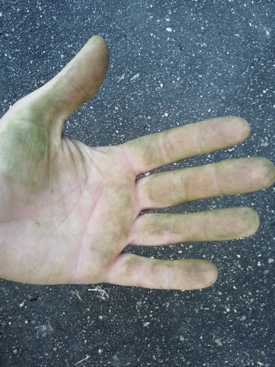 После работы с томатами, особенно подрезка листьев, пасынков, руки покрываются салатовой коркой. После работы руки выглядят так: