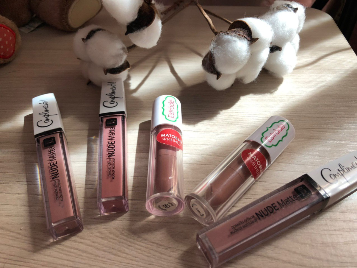 Не так давно помады с матовым финишем вошли в моду. Высокий показатель таких помад это СТОЙКОСТЬ. Данные помады идеальных для тех, у кого нет времени подправить макияж. В этой статье хочу показать вам и рассказать о бюджетных, хороших матовых помадах 2 производителей. Поехали! 1. Белорусский производитель "Complimenti"- цена ~ 220-250 р. Купить можно в магазинах белорусской косметики, остравок с косметикой, Ozon. Текстура кремовая, бархатистая. Аромат у помадок сладкий, ненавящевый. Матовая текстура у них 10 из 10. Волосы к губам не липнут, нигде не оставляют следов, что не мало важно. Застывает помада в течении 10-15 секунд, сушит как впрочем и все матовые помады... Смывается жирными текстурами. Снизу подкреплю фото свотчей 3 нюдовых оттенка. Кстати, палитра вполне разнообразная, можно найти как яркий так и нюдовые оттенки. 2. Французский производитель "Estrade" - цена ~250-280 р. Купить можно в магазинах косметики, интернет-магазинах. Текстура матового тинта нежная, бархатиста